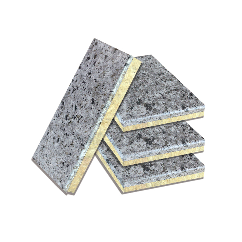 Using vertical wire rock wool as the insulation core material, fluorocarbon metal paint (monochrome, imitation stone) aluminum alloy plate is used as the decorative layer, and a reinforced cement mortar bonding interface layer is compounded on the bottom surface, eliminating the need for perforated inorganic backboards.